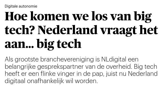 NLDigital, waar het relevante leiderschap voornamelijk bij Amerikaanse big tech vandaan komt, is overigens door de Nederlandse overheid gevraagd hoe we weg moeten komen bij big tech, lezen we in dit uitstekende artikel in Trouw van Nienke Schipper.